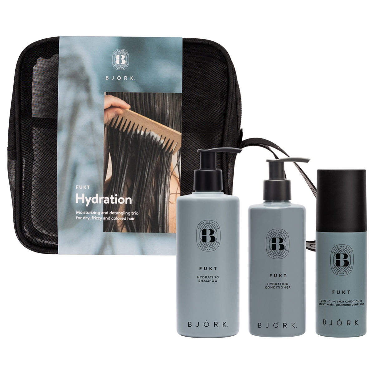 - Fukt Hydrating Shampoo 300ml: Aqua, Sodium Lauroyl Methyl Isethionate, Cocamidopropyl Betaine, Disodium Laureth Sulfosuccinate, Sodium Lauryl Sulfoacetate, Glycol Distearate, Betula Alba Bark Extract, Argania Spinosa Kernel Oil, Glycerin, Hydrolyzed Wheat Starch, Guar Hydroxypropyltrimonium,Chloride, Helianthus Annuus Seed Oil, Amodimethicone/Morpholinomethyl Silsesquioxane Copolymer, Trideceth-5, PEG-150 Pentaerythrityl Tetrastearate, Hydrolyzed Wheat Protein, PPG-2 Hydroxyethyl Cocamide, Propylene Glycol, Dehydroacetic Acid, Benzoic Acid, Quaternium-95, Lactic Acid, Propanediol, Potassium Sorbate, Pentaerythrityl Tetra-Di-T-Butyl Hydroxyhydrocinnamate, Citrus Aurantium Peel Oil, Hexamethylindanopyran, Hexyl Cinnamal, Limonene, Linalyl Acetate, Vanillin, Phenoxyethanol, Parfum. ,Fukt Hydrating Conditioner 250ml: Aqua, Cetearyl Alcohol, PPG-3 Benzyl,Ether Myristate, Behentrimonium Chloride, Polyglyceryl-3 Polyricinoleate, Stearamidopropyl Dimethylamine, Betula Alba Bark Extract, Argania Spinosa Kernel Oil, Glycerin, Helianthus Annuus Seed Oil, Cetrimonium Chloride, Quaternium-95, Caprylyl Glycol, Dimethiconol, Propylene Glycol, Propanediol, Dimethicone, Amodimethicone/Morpholinomethyl Silsesquioxane Copolymer, Pentaerythrityl Tetra-Di-T-Butyl Hydroxyhydrocinnamate, Trideceth-5, Lactic Acid, Citrus Aurantium Peel Oil, Hexamethylindanopyran, Hexyl Cinnamal, Limonene, Linalyl Acetate, Vanillin, Phenoxyethanol, Parfum. ,Fukt Detangling Spray Conditioner 150ml: Aqua, Saccharomyces Cerevisiae Extract, Behentrimonium Chloride, Panthenol, Xylitol, Cetearyl Alcohol, Isopropyl Alcohol, Citric Acid, Ethylhexyl Methoxycinnamate, Diethylamino Hydroxybenzoyl Hexyl Benzoate, Butylene Glycol, Lactic Acid, Betula Alba Bark Extract, Avena Sativa Kernel Extract, Tetrasodium Glutamate Diacetate, Leuconostoc/Radish,Root Ferment Filtrate, Hexyl Cinnamal, Linalool, Limonene, Coumarin, Sorbic Acid, Sodium Benzoate, Potassium Sorbate, Phenoxyethanol, Citrus Aurantium Peel Oil, Hexamethylindanopyran, Vanillin, Linalyl Acetate, Citrus Limon Peel Oil, Parfum.
