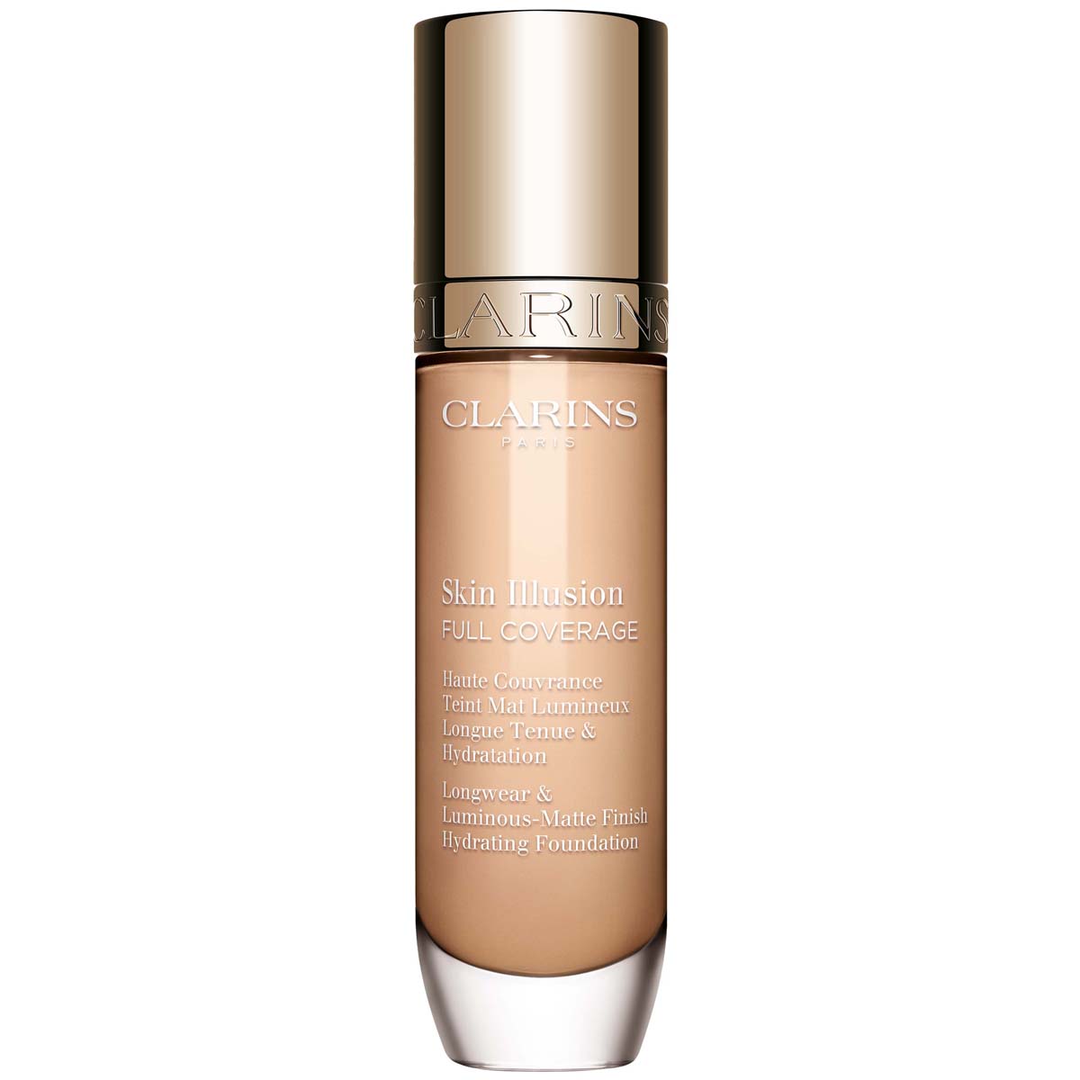 Clarins Skin Illusion Full Coverage. La ikke svette, fukt, tårer eller latter påvirke hudtonen din! Denne foundationen har høy dekkevne som varer i 24 timer og gir en følelse av komfort takket være sin innovative [Skin Fit Technology]-formel som tåler alle følelsesuttrykk. Den har en glødende, matt finish som reduserer glans for en perfekt, silkemyk hudtone fra morgen til kveld. Jevner ut huden uten å skape en ""maskeeffekt"". Den lette og fleksible teksturen føles behagelig og lar huden puste. Skin Illusion Full Coverage kombinerer enestående sminkeprestasjon med dokumenterte hudpleieegenskaper. Den lette formelen er beriket med sinkglukonat, som renser huden og gir en matt effekt. I tillegg virker kombinasjonen av hyaluronsyre og plantebasert mikropatch fuktighetsgivende i 24 timer. Resultatet: Jevnere hud, en matt men strålende finish og synlig færre ujevnheter – for en hud som blir vakrere dag for dag, selv uten sminke.