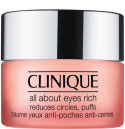 Clinique All About Eyes Rich Eye Cream er en svært fuktighetsgivende øyekrem som effektivt motvirker trøtte, hovne øyne. Øyekremen er utviklet med en rik formel som beroliger huden med intense mengder fuktighet. Samtidig styrker den også hudens fuktbarriere, slik at den blir mer motstandsdyktig mot daglige påvirkninger. Denne øyekremen hjelper også med å redusere synligheten av poser, skygger og mørke ringer under øynene, samt fine linjer, og du vil oppleve en effekt både øyeblikkelig og over tid.