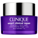 - Clinique Smart Clinical Repair Lifting Face + Neck Cream er en luksuriøs anti-age krem for ansikt og hals, som klinisk dokumentert reduserer rynker og fine linjer, og gir huden et synlig løft samtidig som den glatter ut rynkete hud på halsen. Denne kremen er beriket med multipeptider som styrker huden og støtter den naturlige kollagenproduksjonen, noe som får huden til å se løftet ut og reduserer synligheten av rynker og fine linjer. Samtidig sørger hyaluronsyre, jojobaolje og sheasmør for øyeblikkelig og langvarig fuktighet, gir mer fylde, forbedrer elastisiteten og jevner ut fine tørrhetslinjer.