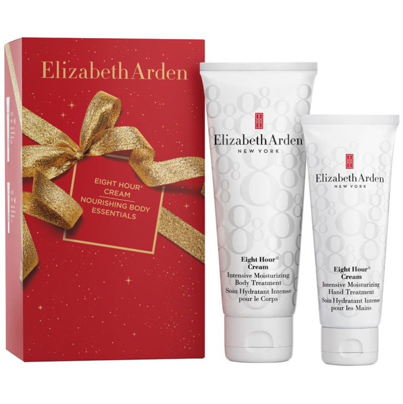 En eksklusiv julegave fra Elizabeth Arden. Dette luksuriøse gavesettet inneholder to ikoniske hudpleieprodukter fra Eight Hour-serien: Hand Treatment og Moisturizing Body Treatment. Eight Hour Moisturizing Body Treatment gir intens fukt og næring – perfekt for tørre områder som knær og albuer. Den kremede konsistensen trekker raskt inn og etterlater huden silkemyk og beroliget. Eight Hour Intensive Moisturizing Hand Treatment gir opptil åtte timers beskyttelse og fuktighet. Den hurtigabsorberende kremen gjør selv sprukne og tørre hender myke og glatte.