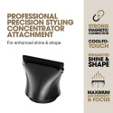 Med et smalt, profesjonelt 66 mm uttak gir denne konsentratordysen en høytrykksluftstrøm som forbedrer formen, øker glansen med 64 %¹ og gir opptil 3x3 løft ved røttene – perfekt for presisjonsstyling med salongresultater.