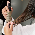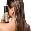 Trinn 2: Aktiver med varme: tørk håret, og ved påføring av direkte varme gjennomgår disse formlene en overgang der nøkkelingredienser blir mer flytende og fordeles enkelt gjennom hvert hårstrå, trenger inn i skjellaget og forsegler de essensielle fordelene