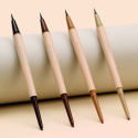 Børst brynene oppover, og bruk den kremete pennen til å fylle ut der det mangler hårstrå med korte strøk oppover i hårets retning. Med denne enden av pennen fyller du ut og definerer formen til brynene. Bruk så den andre enden av pennen til å trekke trådsmale linjer for å skape en illusjon av ekte hårstrå. Med den tynne flytende filtpennen intensiverer du resultatet og skaper tynne hårlignende linjer.