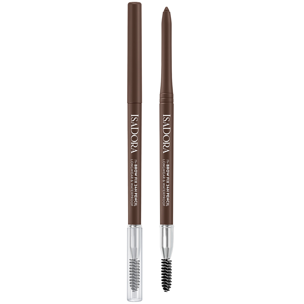 En vannfast øyenbrynspenn som ikke smitter av og holder i 24 timer for å fylle inn og forme øyenbryn. Leter du etter en brynspenn for å fylle inn, sette og forme brynene dine slik at de varer hele dagen og har en naturlig formel? Du trenger ikke lete lenger, vi har det du trenger! Brow Fix 24H Pencil har en uttrekkbar blyant for rask og presis fylling og en myk børste med mikrobust som enkelt blander seg og former øyenbrynene dine. Formelen er basert på naturlig voks og beriket med tevoks og solsikkeolje som gir den enkel påføring som glir på. Den varer i opptil 24 timer og er vannfast slik at du kan være sikker på å holde brynene dine på plass fra tidlig morgen til sent på kveld. Blyanten er tilgjengelig i fire nyanser og leveres med en matt finish for å fremheve et naturlige resultatet. . • Fyller presist inn øyenbryn med en uttrekkbar blyant