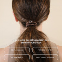 Stilren og tidløs stoffhårstrikk laget av 100 % morbærsilke med en vekt på 22 momme - som er enheten for å måle silkens tykkelse og kvalitet. Et smykke samtidig som den holder håret på plass uten å slite på det ytterste laget, og som dermed fremmer friskt hår.