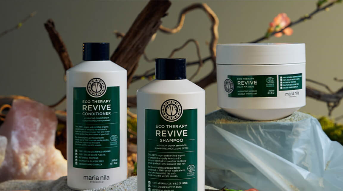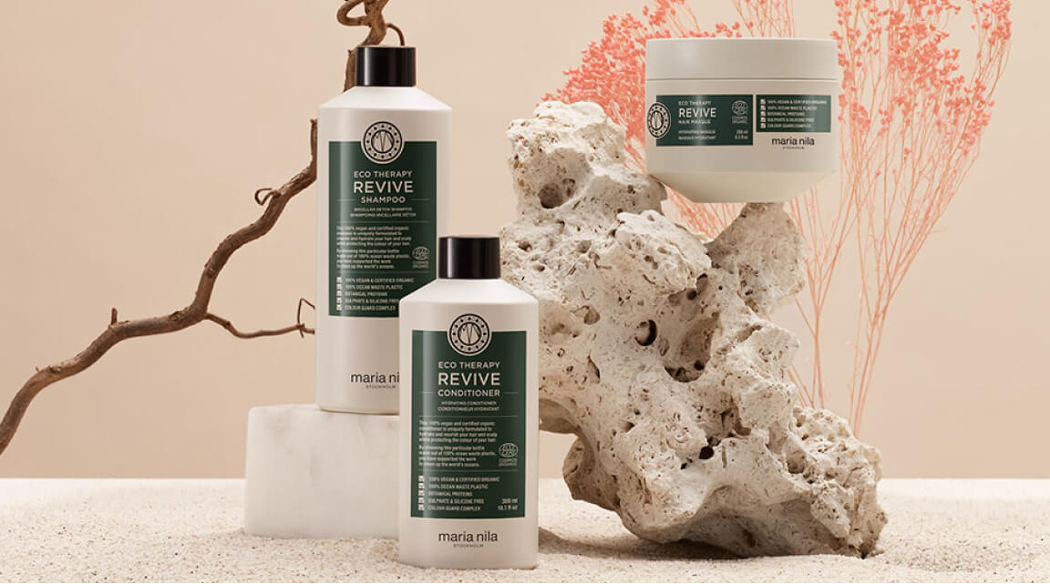 Maria Nila är välkända för sitt engagemang för djuren och vår omvärld, utan att kompromissa med resultatet. Med Eco Therapy Revive tar de miljötänket ett snäpp längre och har utvecklat sin mest innovativa och hållbara serie någonsin. Det är Maria Nilas första serie med den ekologiska cerifieringen COSMOS-Ecocert, där kriterierna är väldigt rigorösa för att bli godkänd. De smarta förpackningarna är producerade av återvunnen plast från haven. Självklart är Eco Therapy Revive 100 procent vegansk och certifierad av PETA, Leaping Bunny and Vegan Society, precis som alla andra produkter från Maria Nila.