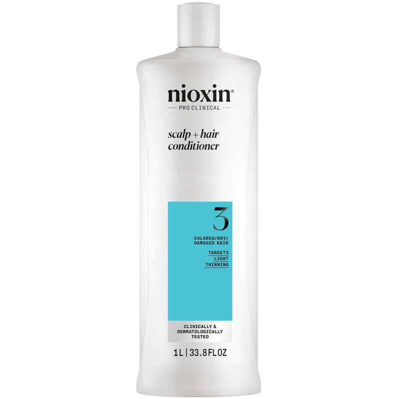 Nioxin System 3 Scalp Therapy Revitalising Conditioner for fargebehandlet hår med lett uttynning er det andre trinnet i en tredelt Nioxin-rutine som er spesielt utviklet for å styrke håret og forebygge avbrekk. Denne klargjørende og nærende balsamen bidrar til å bevare fuktighetsbalansen, styrke hårstrukturen og øke hårets spenst, slik at håret ser sunnere og fyldigere ut. Balsamen med ekstrakt av hvit te og peppermynteolje er klinisk utprøvd og dermatologisk testet, og reduserer hårtap på grunn av brekkasje med opptil 91 %* og er egnet for fargebehandlet hår med normal til lett uttynning. Bruk sammen med Nioxin System 3 Cleanser Shampoo og Nioxin System 3 Treatment for best resultat. Tilgjengelig i 2 størrelser: 300 ml og 1000 ml.