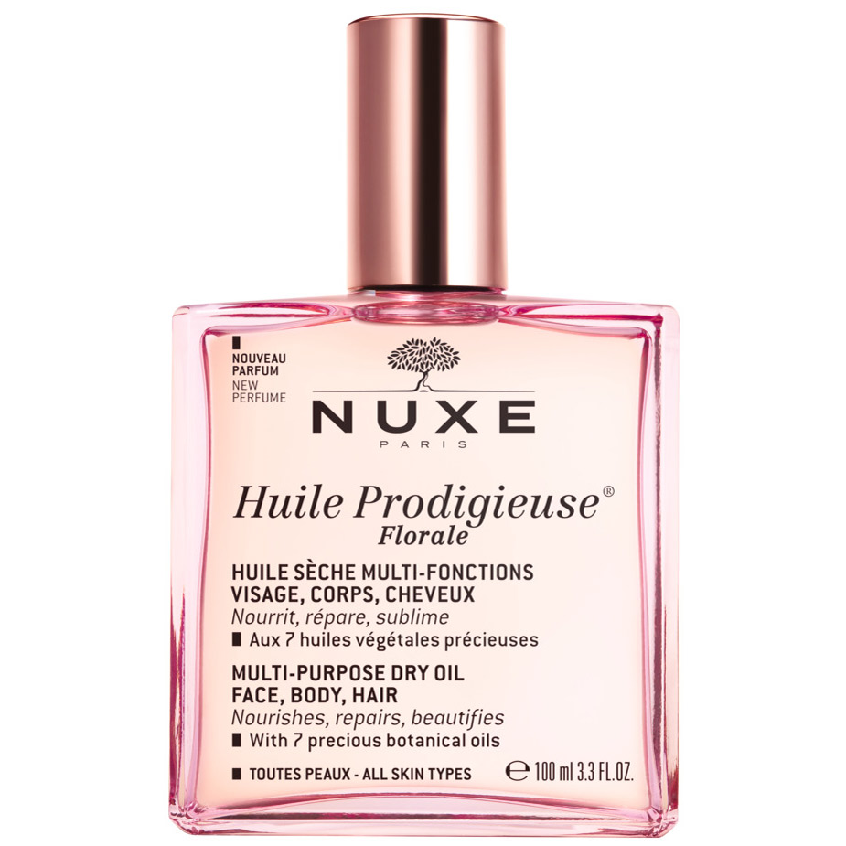 Huile Prodigieuse Florale er en multifunksjonell tørr olje med spray og delikat blomsterduft. Den er uunnværlig for ansikt, kropp og hår for å gi fuktighet og pleie til huden og glans til håret. Denne rosa skjønnheten har fått en delikat ny frisk og sprudlende blomsterduft av magnolia, moskus og grapefruktskall. Du kan med fordel påføre tørroljen på fuktig hud når du går ut av dusjen. Den kan også brukes i håret, enten for å gi glans og samle tørre hårspisser eller som en hårkur før du vasker håret. Hvis du skal vise frem beina, ser de enda vakrere ut med et lag Huile Prodigieuse. Oljen kan også brukes under dagkremen din for å få et ekstra lag med fuktighet og pleie eller som en del av kveldsrutinen din.