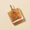 Huile Prodigieuse Gold Dry Oil er en multifunksjonell tørr olje med pumpe til ansikt, kropp og hår, som nærer, reparerer og mykgjør. De multireflekterende partiklene i denne gyldne versjonen av Huile Prodigieuse gir glans og glamour. Resultat: Glatt hud og silkemykt hår som diskret lyser opp med gyldne refleksjoner. Uten parabener og silikoner.