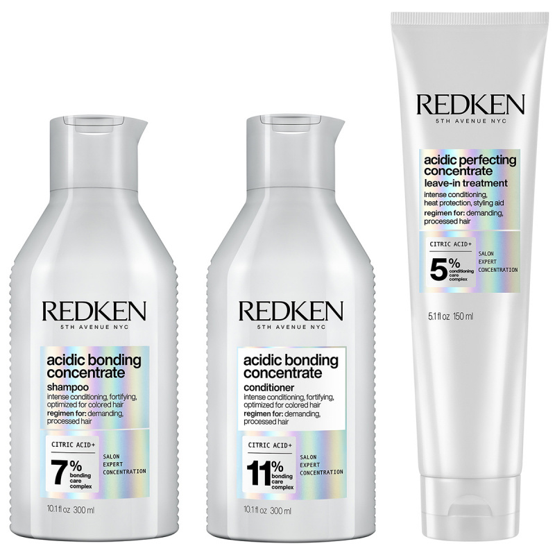 **** Når brukt sammen med Acidic Bonding Concentrate shampoo, balsam og leave-in treatment vs. ikke-pleiende shampoo.Bekjemp ett års synlig skade på én gang* med Redken sin fire-trinns Acidic Bonding Concentrate-serie.