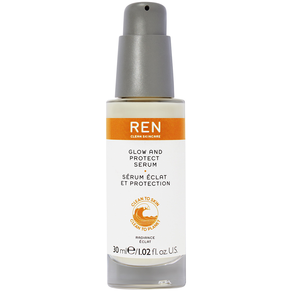 REN Glow and protect serum gir jevnere hudtone og glød i løpet av 14 dager. Den inneholder beskyttende antioksidanter som bidrar til å beskytte huden fra skader fra frie radikaler. skader. Huden kjennes mykere og glattere, med en sunn frisk glød. Produktet er vegansk og emballasjen er laget av resirkulert plast.