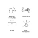 Masken pleier intensivt skadet hår og beskytter hårets fibre. Det aktive komplekset reduserer risikoen for at håret brekker, gjør det sterkere og reparerer håret dypt med bare én påføring. I tillegg gjør det at skadet hår blir glattere og mer håndterbart slik at ytterligere mekanisk skade kan forhindres.